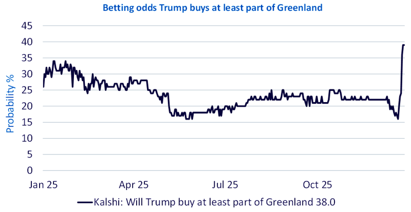 Fonte: Bloomberg, https://kalshi.com/markets/kxgreenland/greenland-purchase all’8 gennaio 2026. I rendimenti passati non sono indicativi di quelli futuri e qualsiasi investimento può subire una perdita di valore.
