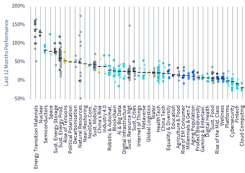 - Transizione energetica – Materiali è il tema con la performance migliore nel periodo, con una media del 139%. Tuttavia, la strategia migliore ha registrato un rendimento del 234%, mentre la peggiore ha ottenuto il 52,4%. Si tratta di un divario, in termini di performance, del 182% tra due strategie appartenenti allo stesso tema.
